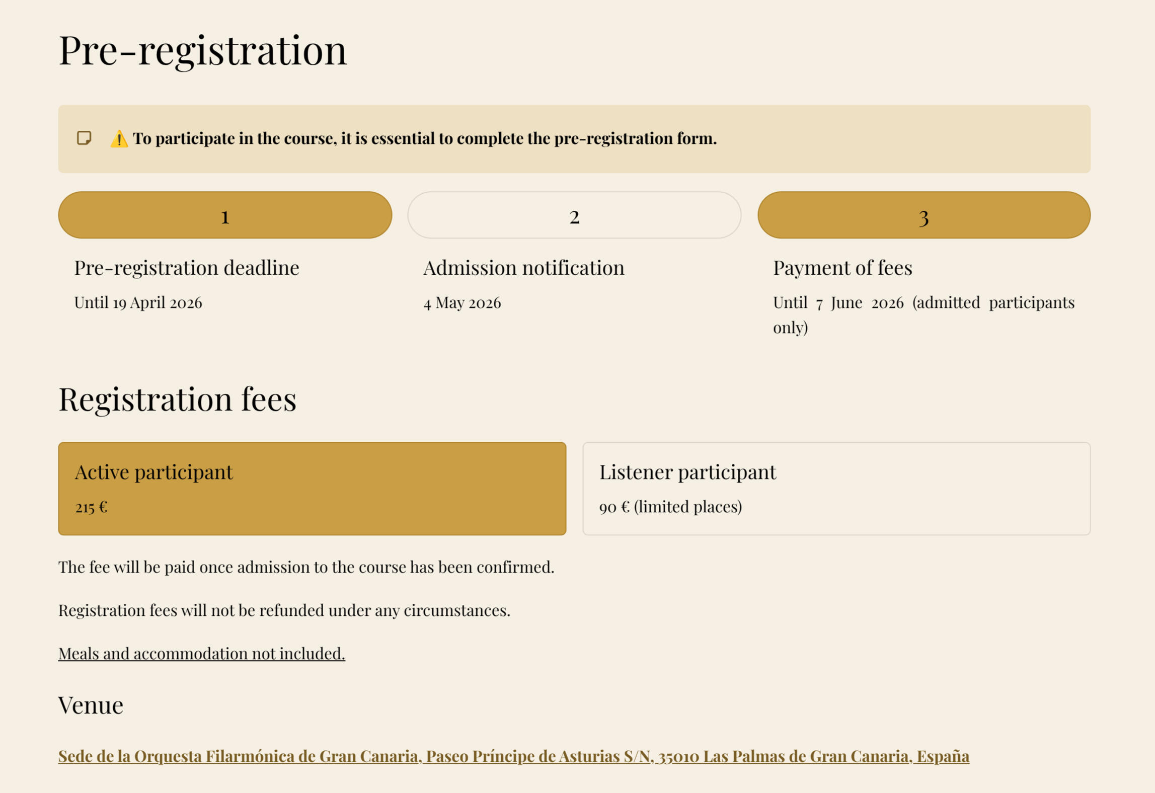 The course is complemented by a programme of concerts and public activities, conceived as a natural extension of the pedagogical work. These initiatives bring Renaissance and Baroque music closer to the cultural life of Las Palmas.