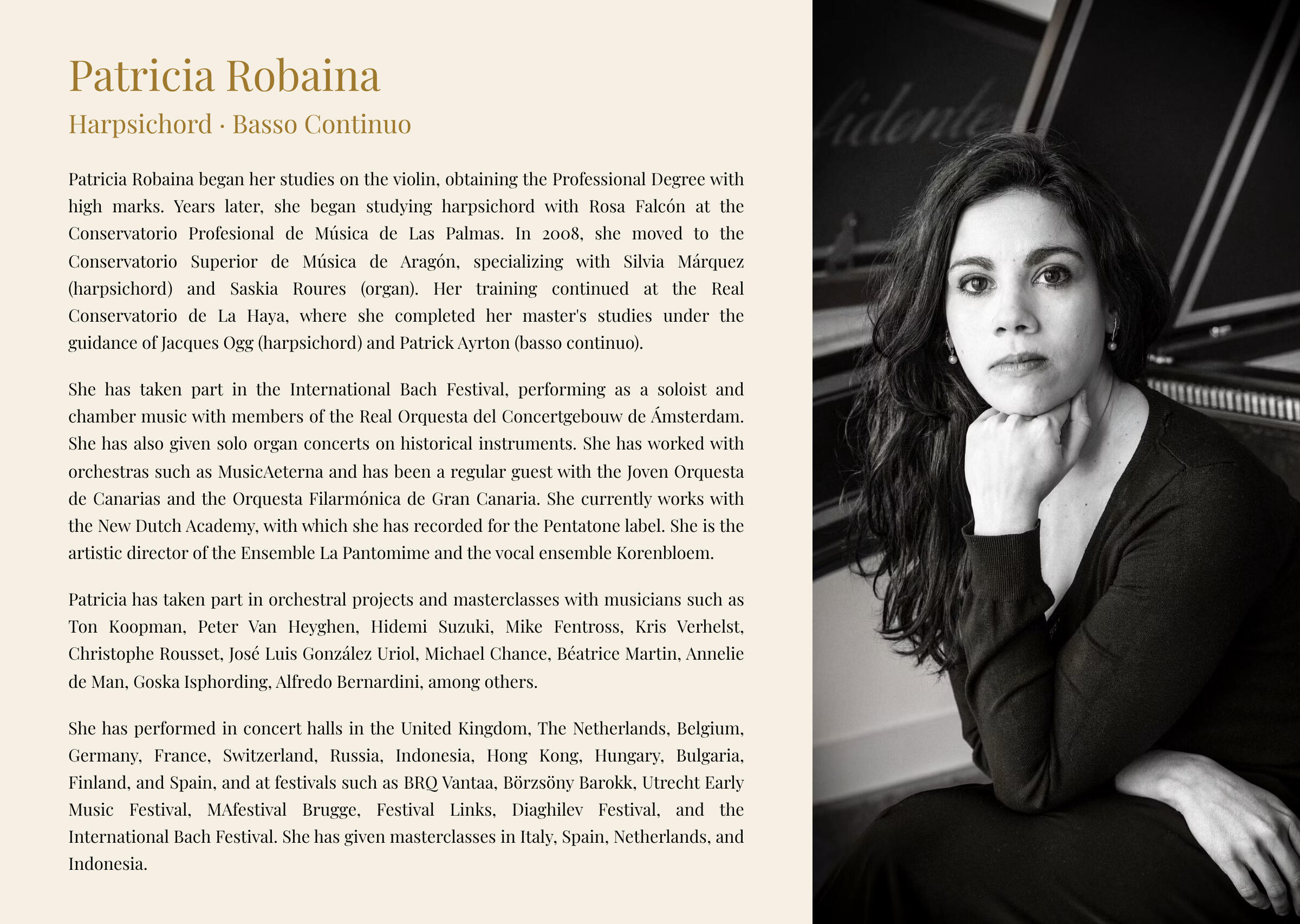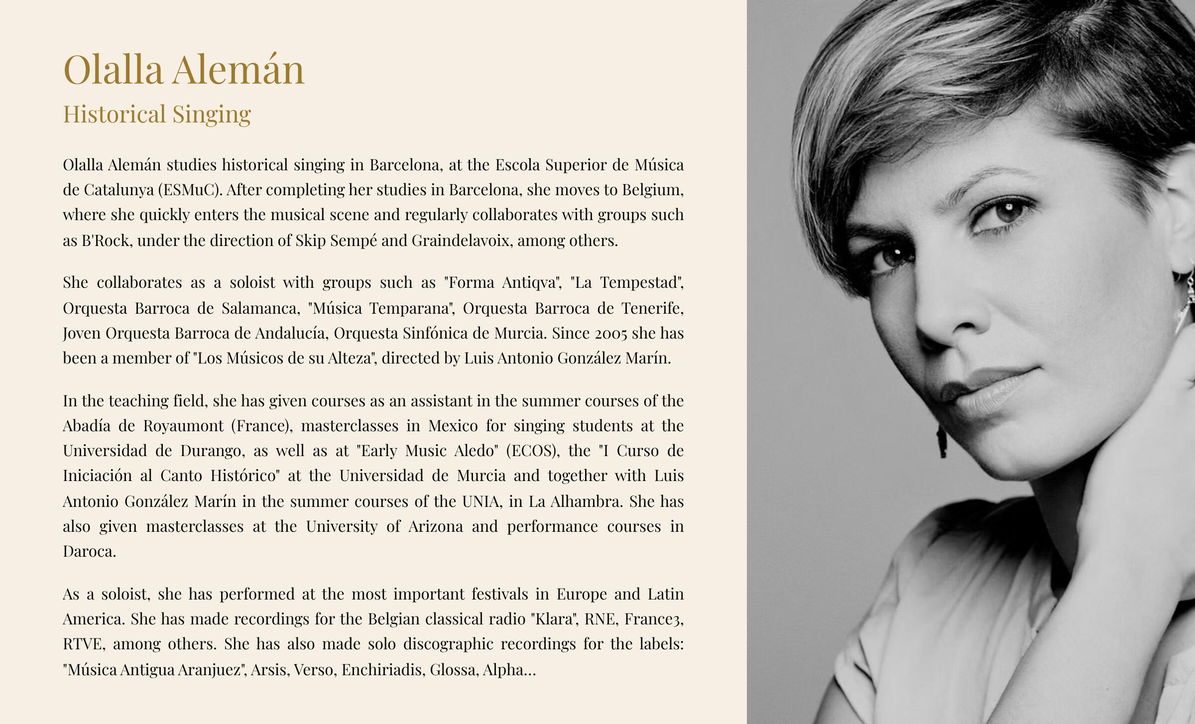 The fourth International Early Music Course in Las Palmas brings together a faculty of performers specialised in historically informed performance, with a distinguished artistic and pedagogical background.The faculty members are active as soloists, chamber musicians, and collaborators with some of Europe’s leading Early Music orchestras and ensembles. They regularly perform at international festivals and concert venues.Through their artistic and teaching experience, they guide participants in a learning process that combines historical rigour, stylistic reflection, and musical practice.